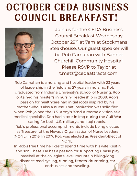 CEDA business council breakfast October 29, 2025 1:38 AM Location: Stockman's Steak House - 1560 W. Williams Ave., Fallon, NV 89406 USA Tickets: FreeCategory: Upcoming Events Generate iCal Return to Calendar