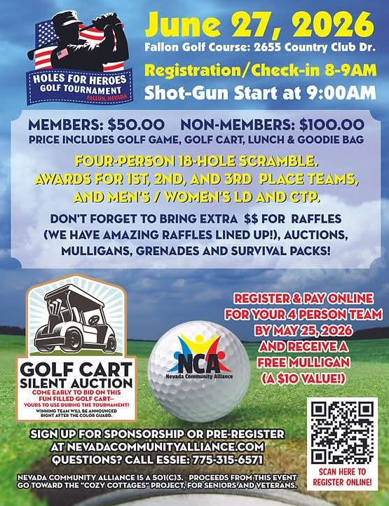 Four Person 18 Hole Scramble June 27, 2026 9:00 AM Location: Fallon Golf CourseTickets: FreeCategory: Upcoming Events Generate iCal Return to Calendar