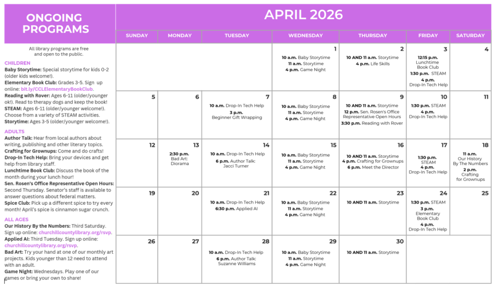 Library April Calendar May 1, 2026 10:56 AM Location: Churchill County Library - 553 S Maine St, Fallon, NV 89406 United States Tickets: FreeCategory: This Week Generate iCal Return to Calendar