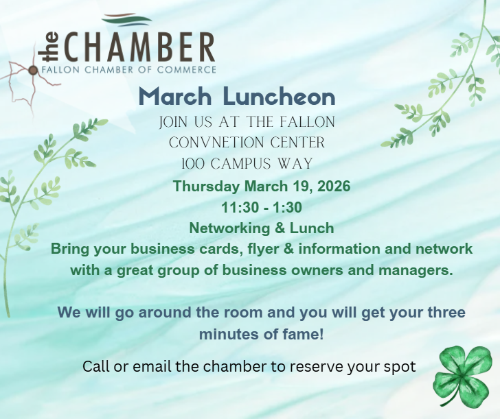 March Luncheon January 24, 2026 - February 25, 2026 3:59 AM Location: Fallon Convention Center - 100 Campus Way, Fallon, NV 89406 USA Tickets: FreeCategory: Chamber Events, This Week Generate iCal Return to Calendar
