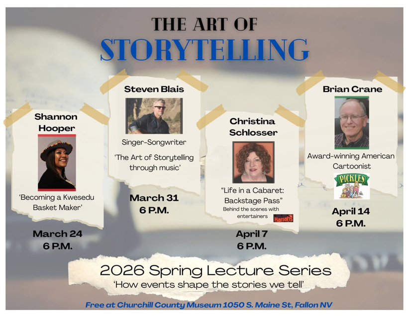 The Art of Storytelling March 24, 2026 4:50 AM Location: Churchill County MuseumTickets: FreeCategory: This Week Generate iCal Return to Calendar