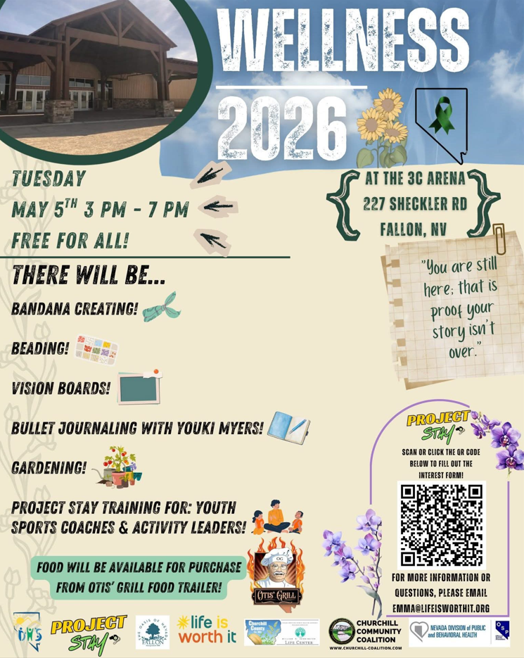Wellness Event 2026 May 5, 2026 12:28 PM Location: 325 Sheckler Rd Fallon NV 89406Rafter 3C ArenaTickets: FreeCategory: Upcoming Events Generate iCal Return to Calendar