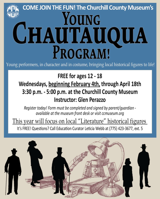 Young Chautauqua Program March 25, 2026 - April 15, 2026 9:32 AM Location: Churchill County MuseumTickets: FreeCategory: This Week Generate iCal Return to Calendar